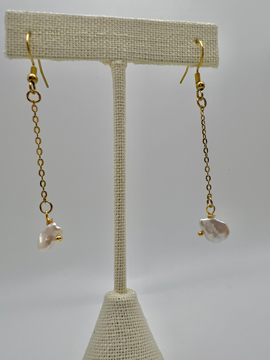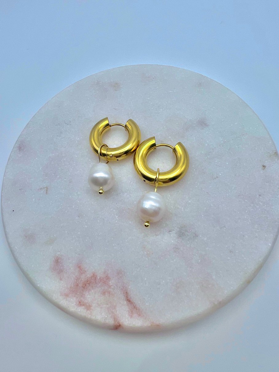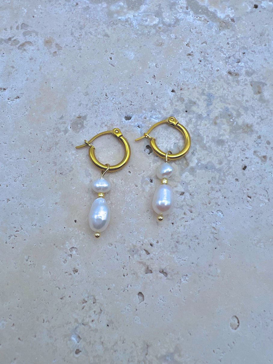 elongated + smaller round freshwater pearls stacked on a dainty gold hoop