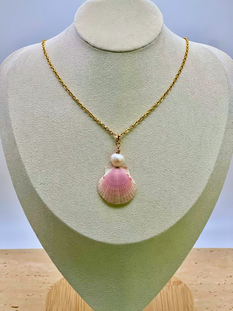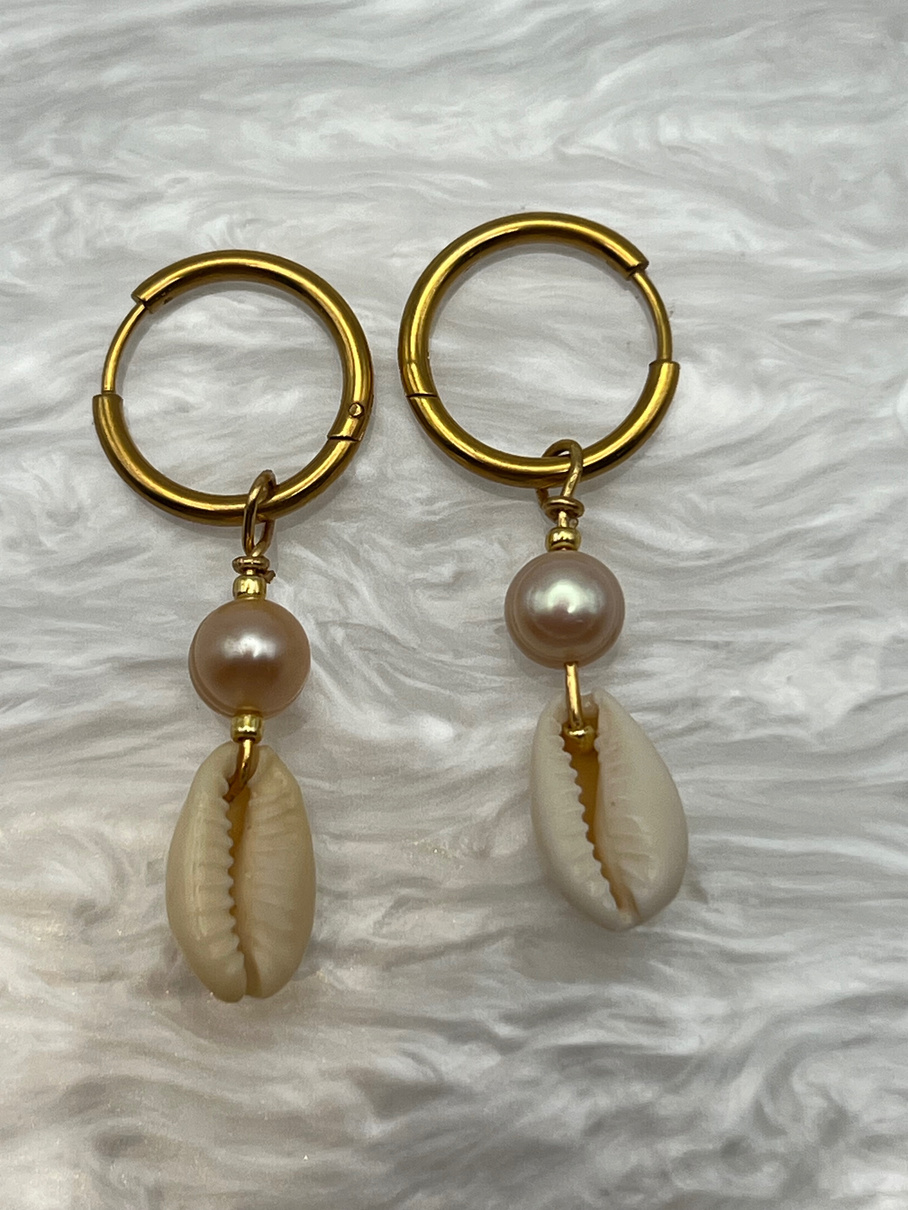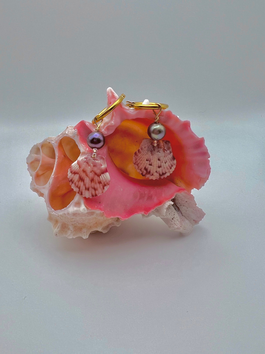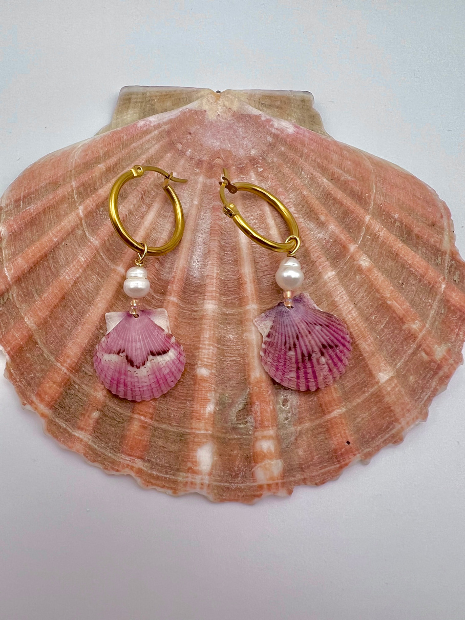 MINI SCALLOP + PINK PEARL ON GOLD HOOPS