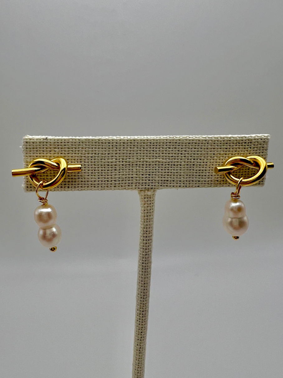 FRESHWATER PEARLS HUNG FROM GOLD KNOT STUDS