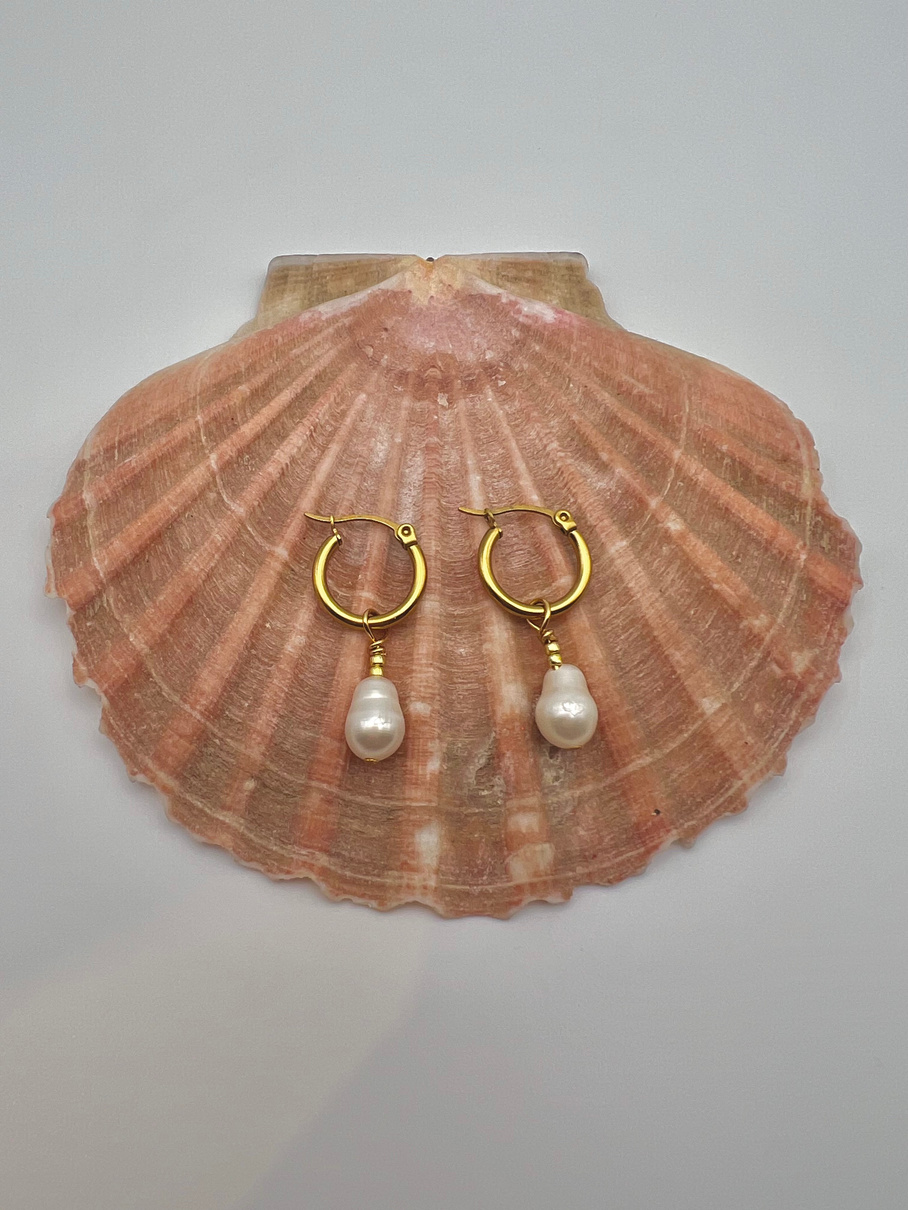 MINI SCALLOP + WHITE PEARL ON GOLD HOOPS